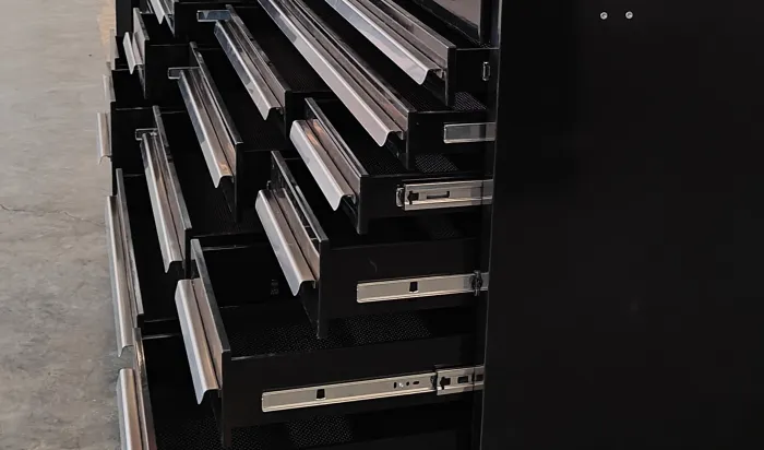 Səssiz slayd rayları: Qara çox funksiyalı alət kabineti, hamar çəkmə hərəkəti və güclü yük daşıyan qabiliyyətə sahib ağır səssiz slayd relsləri var.